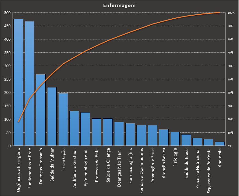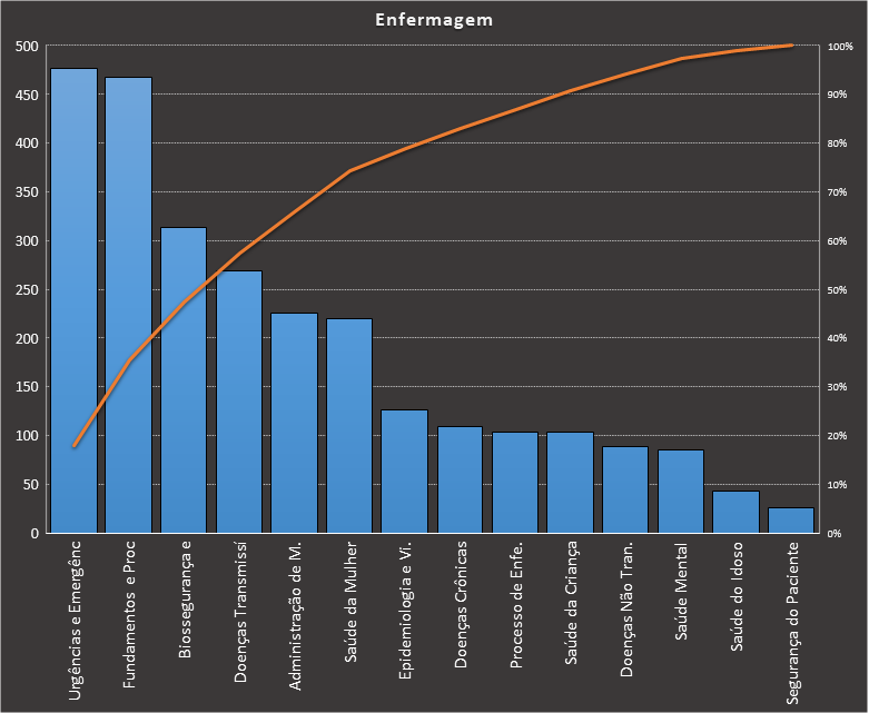 Em Enfermagem, nos baseamos neste caderno, contendo 2.654 questões. Usamos como filtro questões de concursos para servidores da área judiciária. Veja como ficou a distribuição.