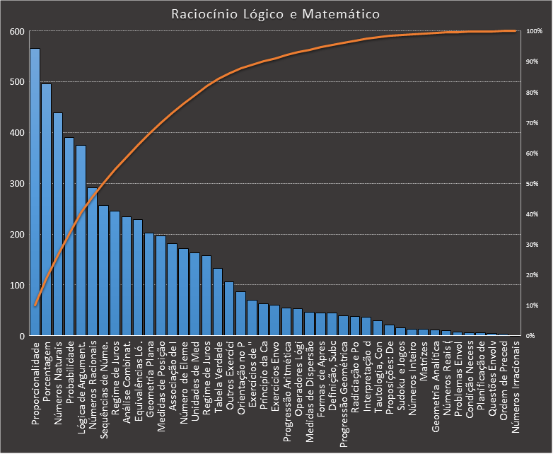 Em Raciocínio Lógico e Matemático, nos baseamos neste caderno, contendo 5.614 questões. Usamos como filtro questões de concursos para servidores da área judiciária. Veja como ficou a distribuição.