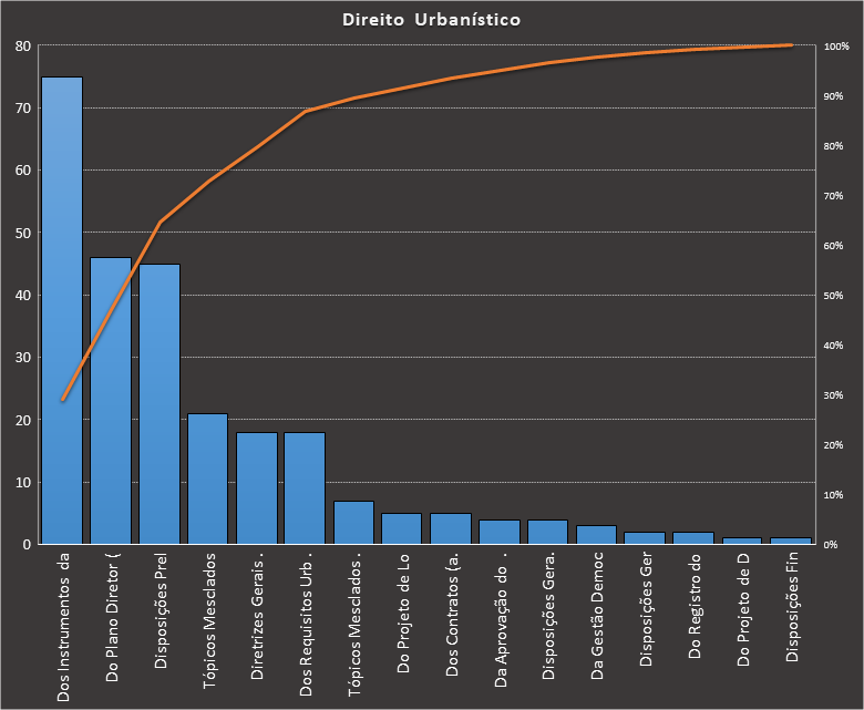 Em Direito Urbanístico, nos baseamos neste caderno, contendo 257 questões. Usamos como filtro questões de concursos para servidores da área judiciária. Veja como ficou a distribuição.