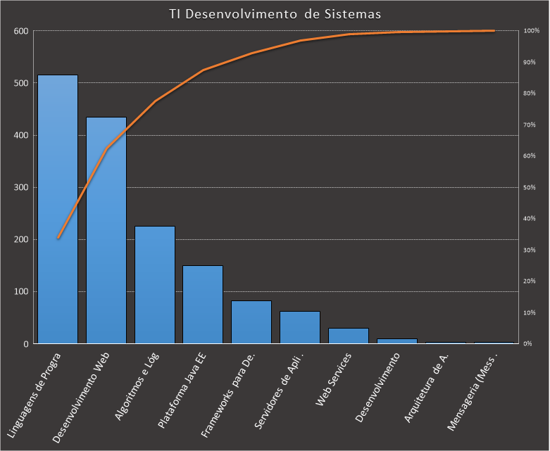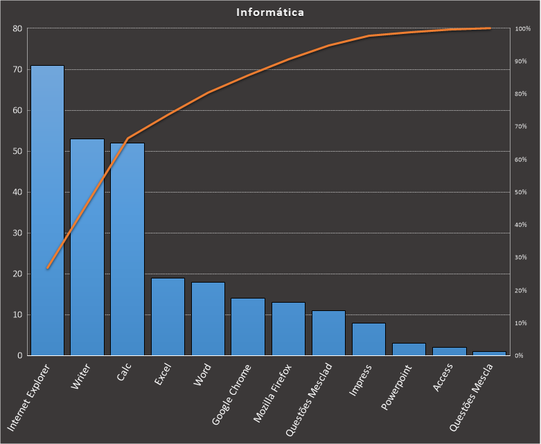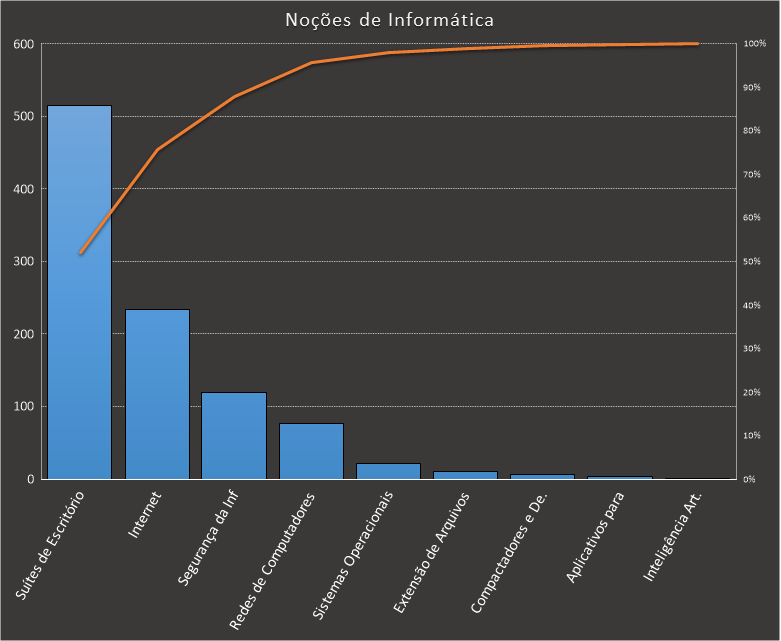 O caderno base contou com 988 questões. O tópico Suítes de Escritório representa, por si só, 52% das questões. Embora a distribuição a seguir não apresente essa subdivisão, é interessante pontuar que, dentro de "Suítes de Escritório", o subtópico mais recorrente é "Microsoft Office", que responde por quase 40% de todas as questões. A distribuição é esta: