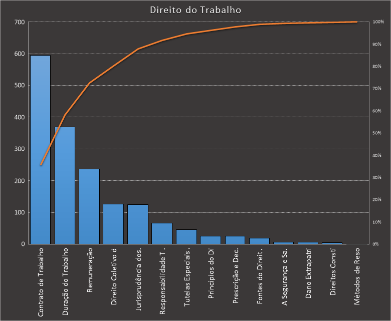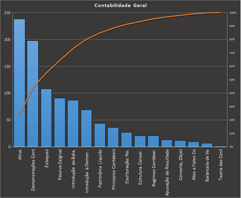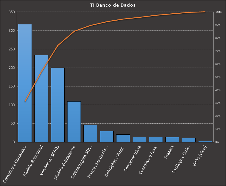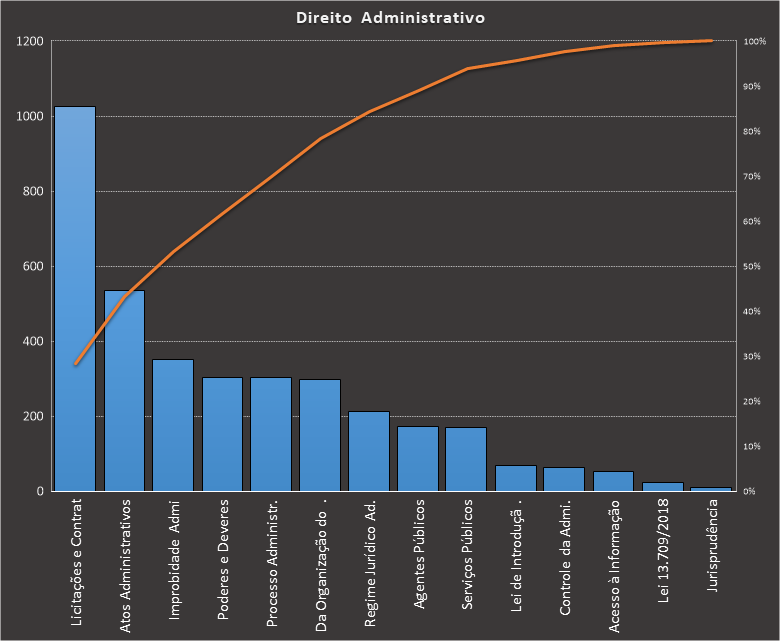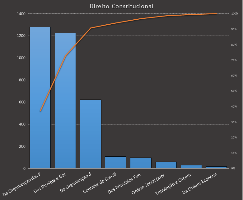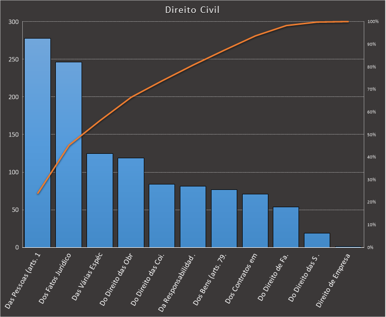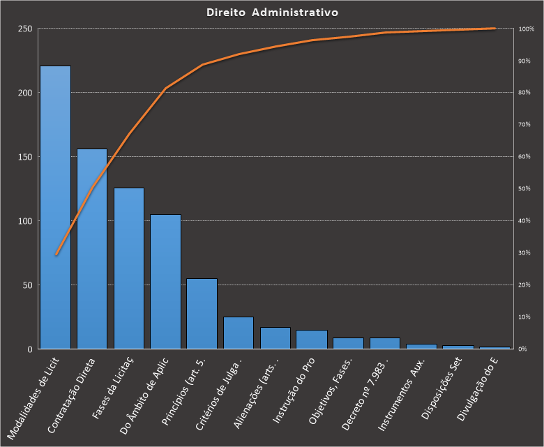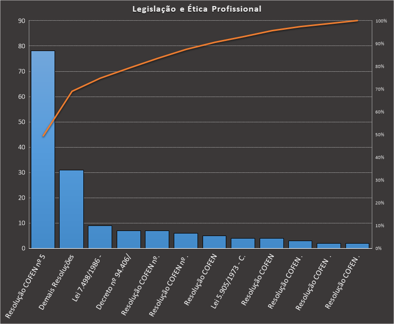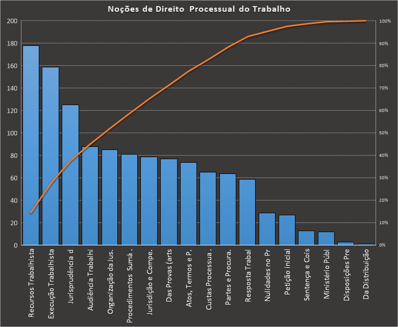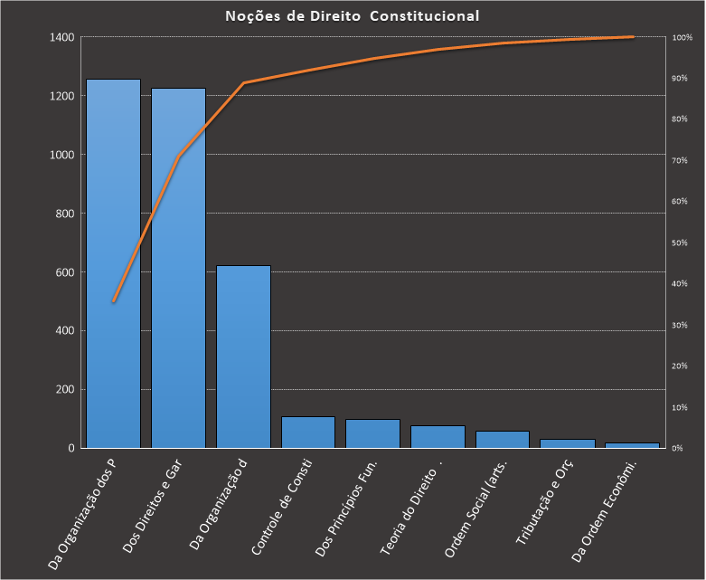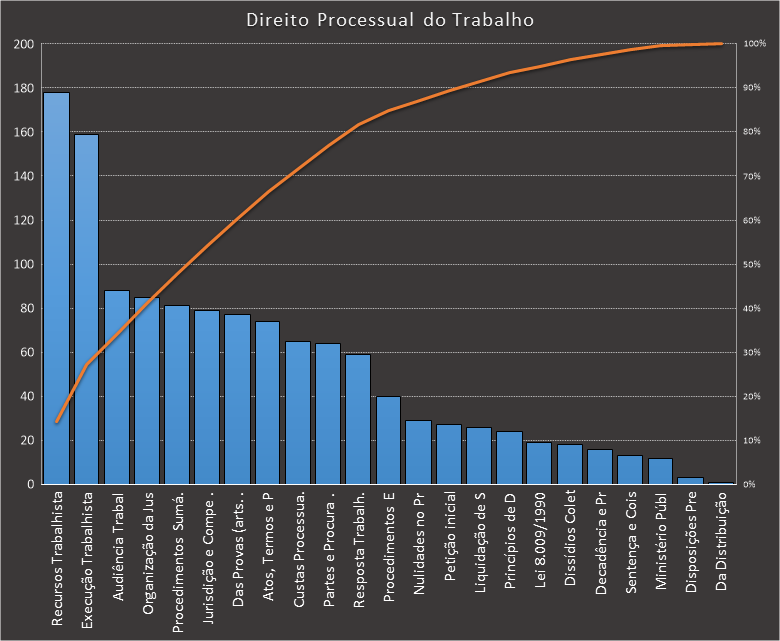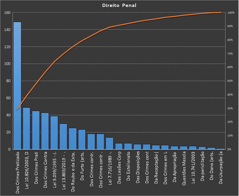 Para esta matéria em específico, temos destacados de azul 5 tópicos cuja porcentagem acumulada é de 74%. Isso significa que apenas 5 assuntos cobrem 74% de todas as questões da matéria que obedecem aos filtros utilizados.