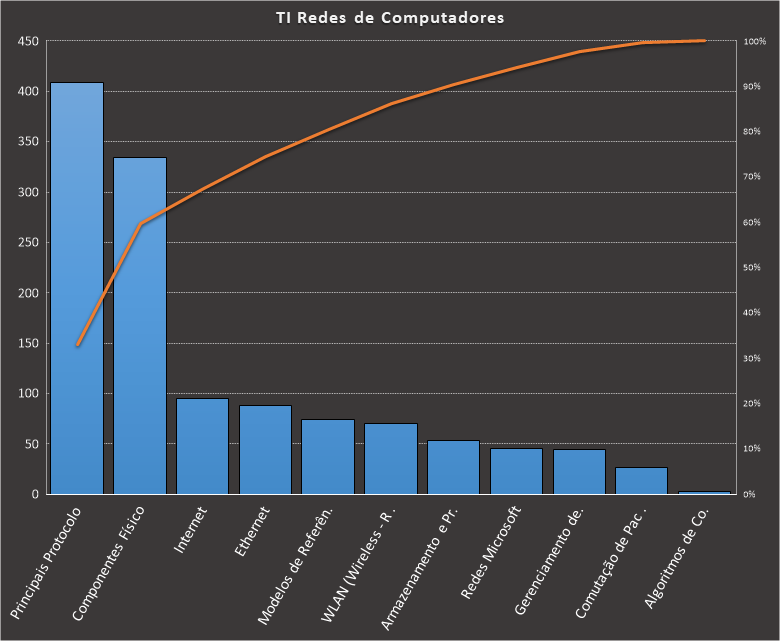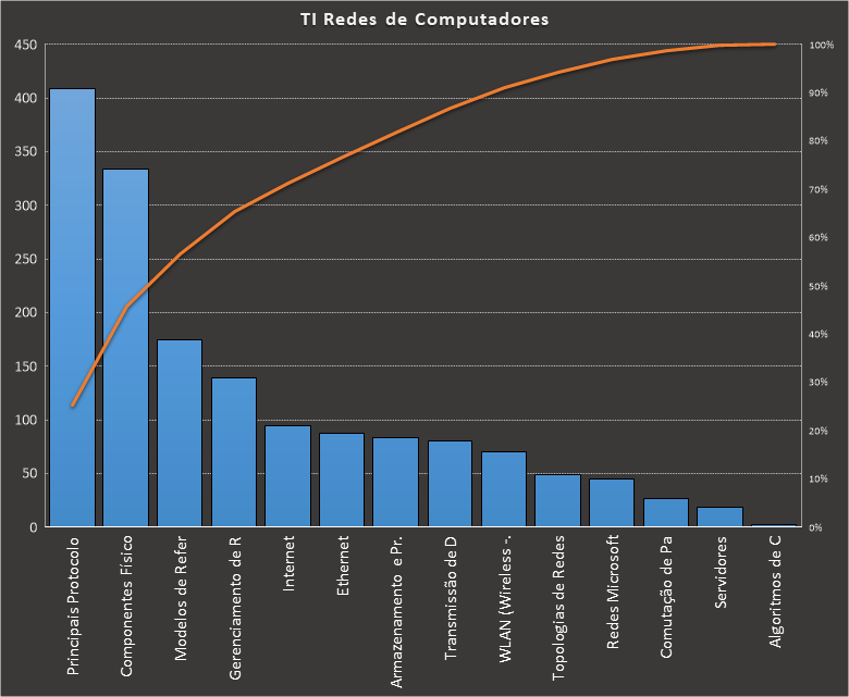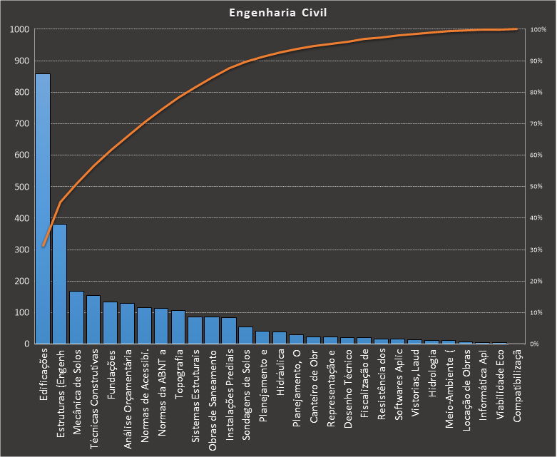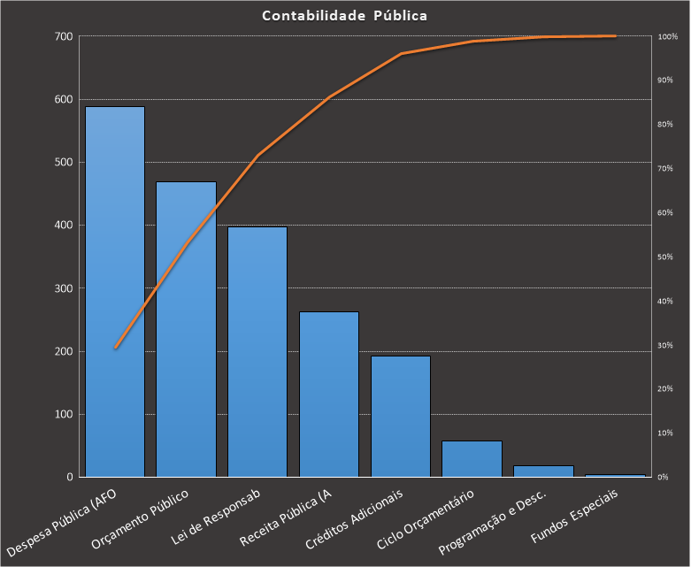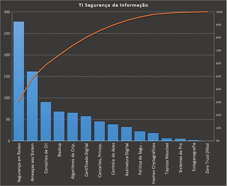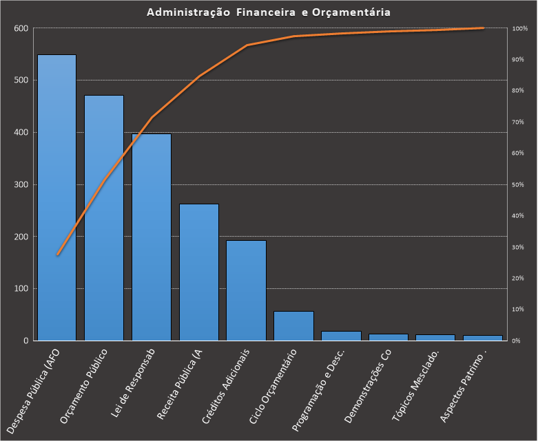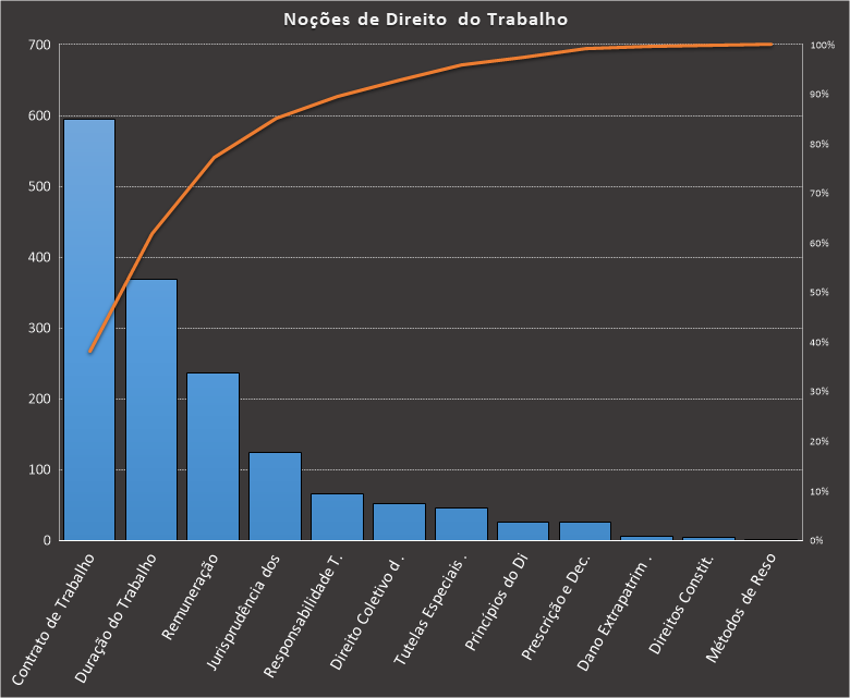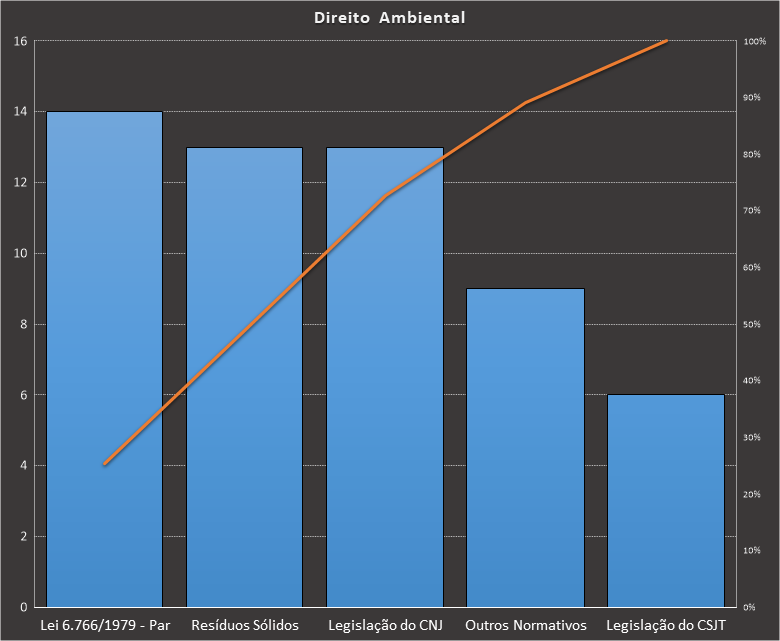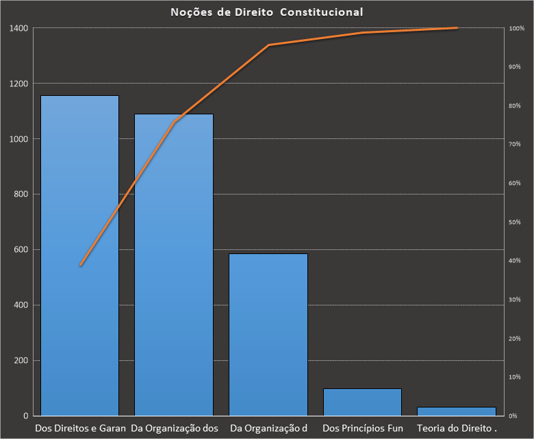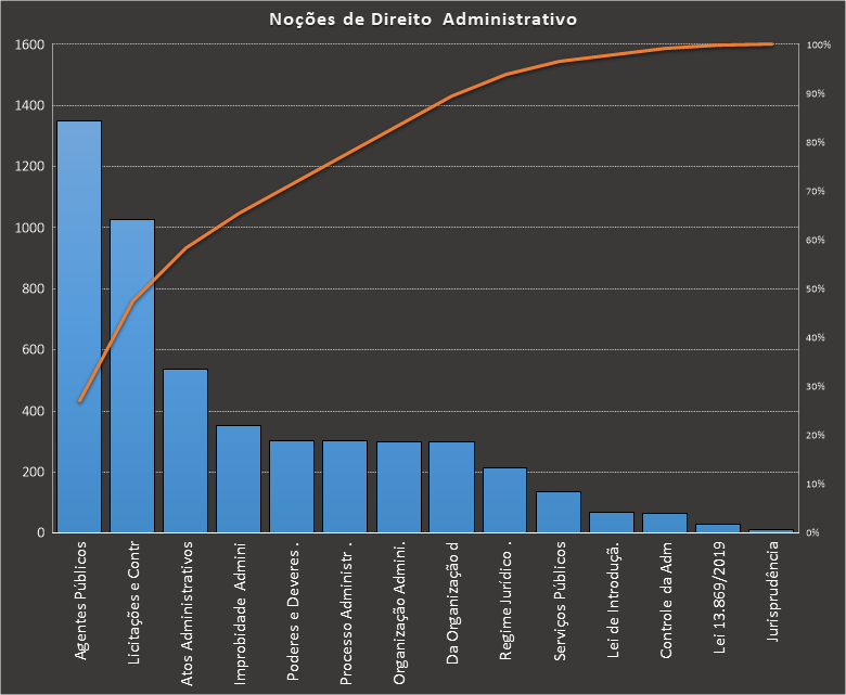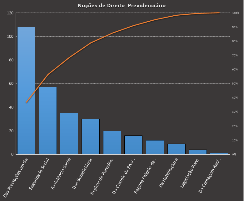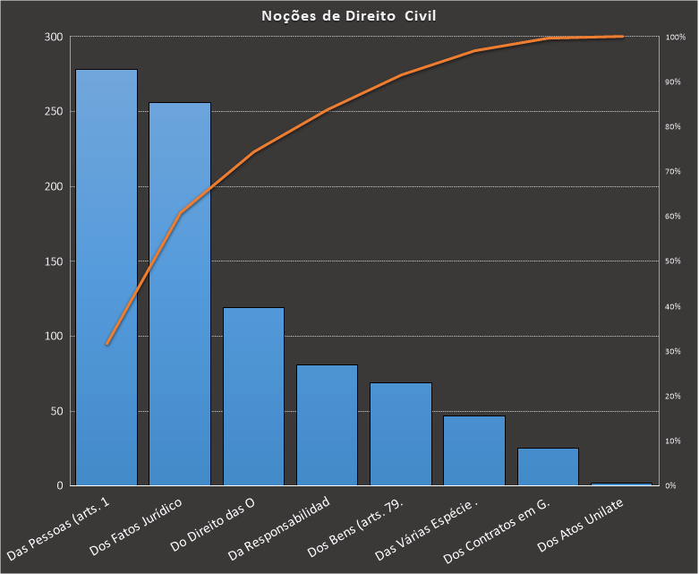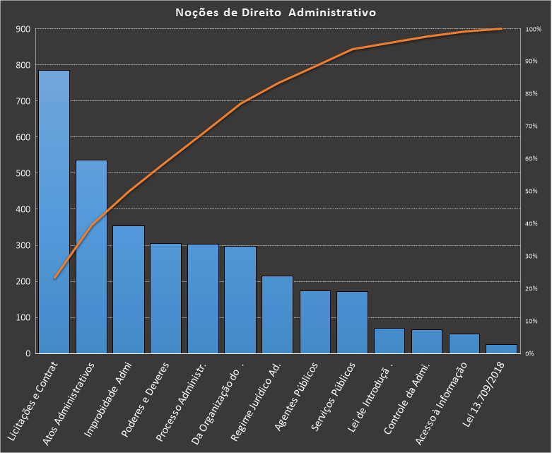 Para esta matéria em específico, temos destacados de azul 5 tópicos cuja porcentagem acumulada é de 74%. Isso significa que apenas 5 assuntos cobrem 74% de todas as questões da matéria que obedecem aos filtros utilizados.