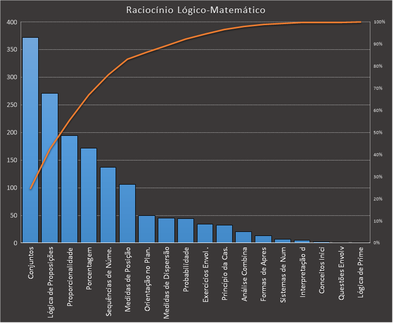 Em Raciocínio Lógico-Matemático, nos baseamos neste caderno, contendo 1.506 questões. Usamos como filtros questões de concursos para servidores da área judiciária elaboradas pela banca FCC. Veja como ficou a distribuição.