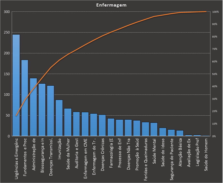 Em Enfermagem, nos baseamos neste caderno, contendo 1.483 questões. Usamos como filtros questões de concursos para servidores da área judiciária elaboradas pela banca FCC. Veja como ficou a distribuição.