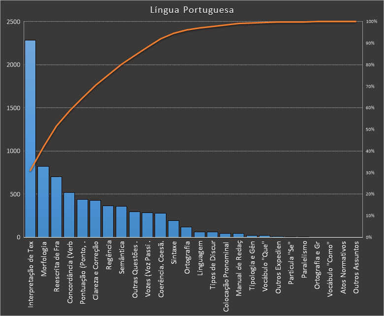 Em Língua Portuguesa, nos baseamos neste caderno, contendo 7.368 questões. O resultado está na tabela abaixo. Em todas as tabelas deste artigo destacamos de cor azul os assuntos que atingem porcentagem acumulada de 70%.