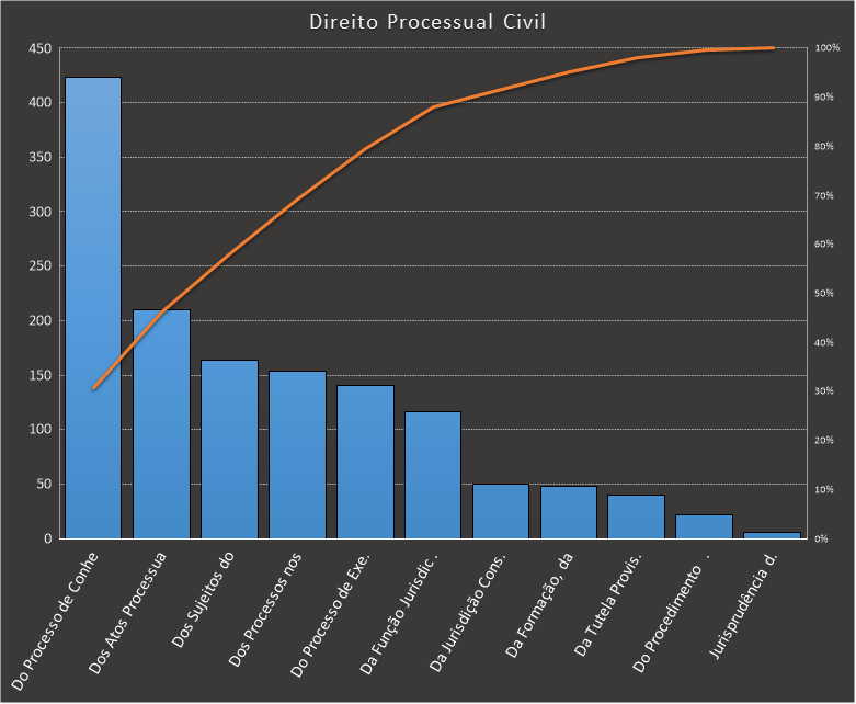 Para esta matéria nos baseamos neste caderno, contendo 1.038 questões. Usamos como filtros questões de concursos para servidores da área judiciária elaboradas pela banca FCC. Como resultado temos o seguinte.