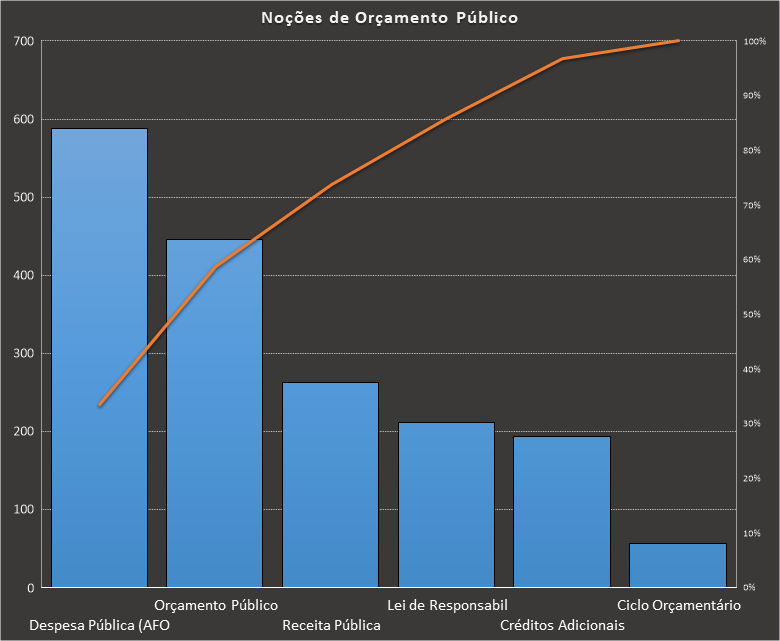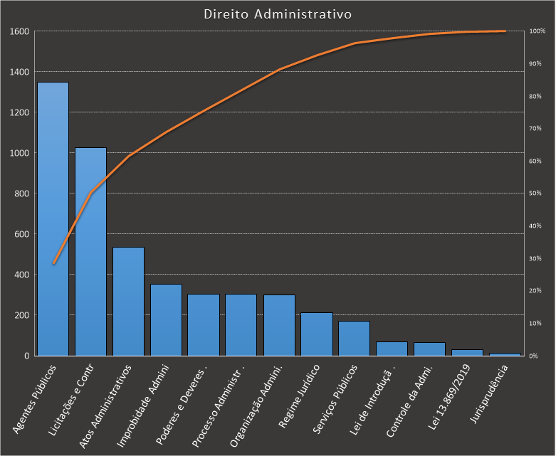 O caderno base contou com 263 questões. Usamos como filtros questões de concursos para servidores da área judiciária elaboradas pela banca FCC. A distribuição é esta: