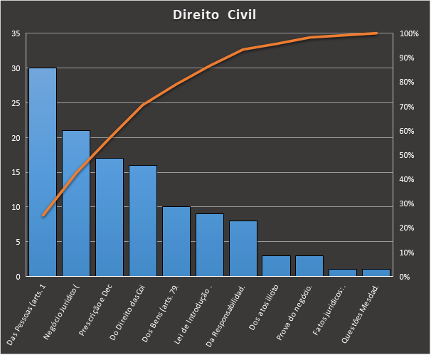 2) Direito Civil Em Direito Civil, nos baseamos neste caderno: https://www.tecconcursos.com.br/s/Q245UH, contendo 119 questões. Usamos como filtro questões da banca IBFC. Veja abaixo como ficou a distribuição.