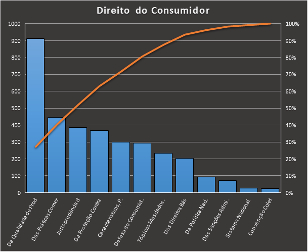 3) Direito do Consumidor O caderno base, https://www.tecconcursos.com.br/s/Q245XH, contou com 3.358 questões. Aqui não utilizamos filtros da banca, pois sua inclusão resultaria em quantidade reduzida de questões, impedindo identificação de assuntos mais cobrados. Sendo assim, a distribuição abaixo mostra como as bancas em geral cobram os tópico abordados no edital. A distribuição é esta: