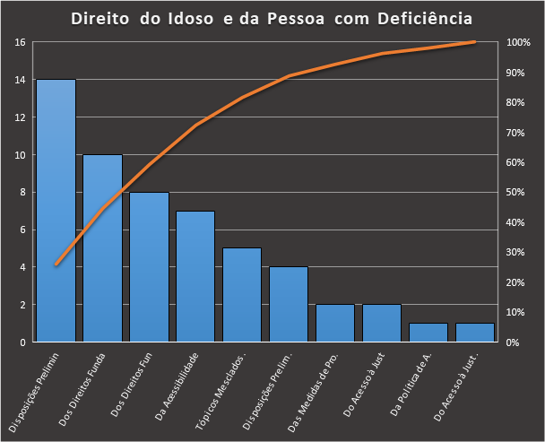 4) Direito do Idoso e da Pessoa com Deficiência Para esta matéria nos baseamos neste caderno: https://www.tecconcursos.com.br/s/Q245UK, contendo 54 questões. Usamos como filtro questões da banca IBFC, resultando na seguinte distribuição: