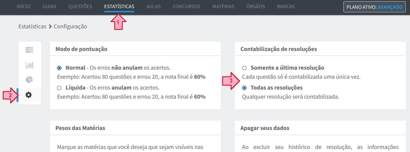 Basta acessar a aba superior "Estatísticas" (1) e selecionar a opção "Configurações" (2) do lado esquerdo, e escolher a forma de contabilização (3) conforme figura abaixo: