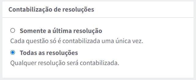 Mas que recurso é esse? Trata-se de uma configuração da seção Estatísticas que afeta como seu desempenho é medido. A partir desta versão, você pode escolher entre contabilizar somente a última resolução em cada questão (nova opção) OU contabilizar todas as resoluções (forma que já existia).