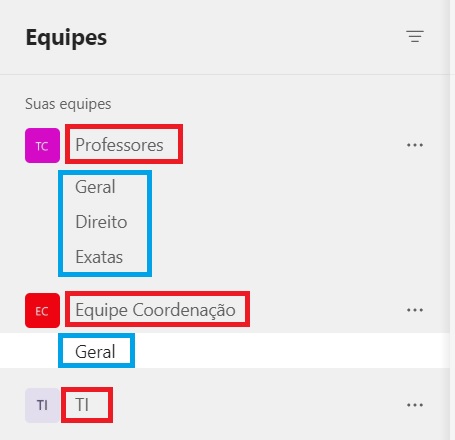 Vou tentar ser mais claro. Há uma organização que pode ser dividida em equipes e estas podem ser divididas em canais. Vejamos uma explicação mais prática para facilitar o entendimento.