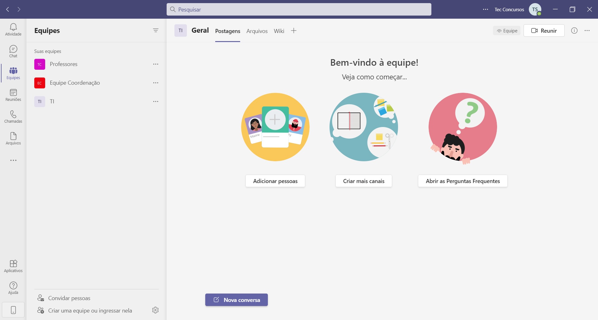 Abaixo, o Teams aberto em umas de seus principais recursos.