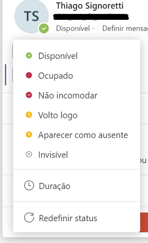 Status: também chamado de presença, indica a disponibilidade e o status atual do usuário para outros usuários do Teams. É representado por um pequeno ponto colorido no perfil: