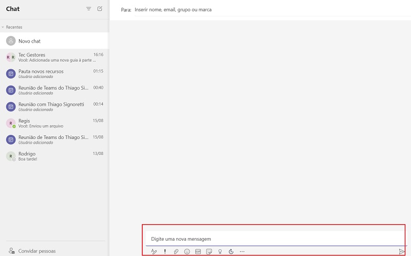 A Microsoft diz que "o chat está no centro de tudo o que é feito no Teams". De fato, a importância de tal recurso é tanta que ele substitui o e-mail (sim, não há ferramenta de e-mails no Teams - o que há é, de maneira bem restrita, possibilidade de você acionar outro serviço como Outlook, Gmail etc.). Os chats são mas dinâmicos e possibilitam uma melhor interação da equipe e lembram muito os outros chats que estamos acostumados a usar em diversos aplicativos. A grande diferença é que no Teams os Chats são mais organizados e possibilitam muito mais integração entre os participantes e seu trabalho.