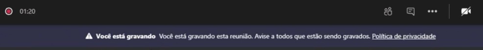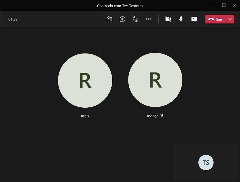 Abrirá uma tela com os recursos padrões deste tipo de serviço. As pessoas que poderão participar dessa chamada são as mesmas que se encontram naquele chat. A qualquer momento a chamada pode ser encerrada. Esta tela é a mesma em qualquer outra seção do Teams em que seja possível realizar chamadas (e como veremos não são poucas, rs!), como por exemplo na aba Reuniões/Calendário.