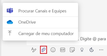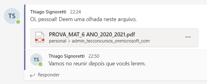 Mas existe, também, a hipótese se enviar arquivos por meio de canais ou chats diretamente nas mensagens ou pelas guias na parte superior de cada recurso. Abaixo, um print da primeira forma: