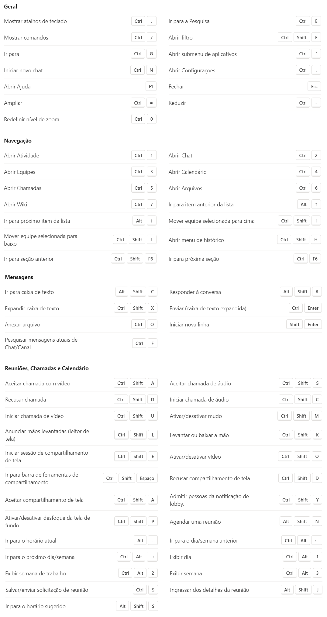 Abaixo, transcrevo teclas de atalhos retiradas da ajuda do próprio MS Teams, em sua versão paga e na configuração padrão.