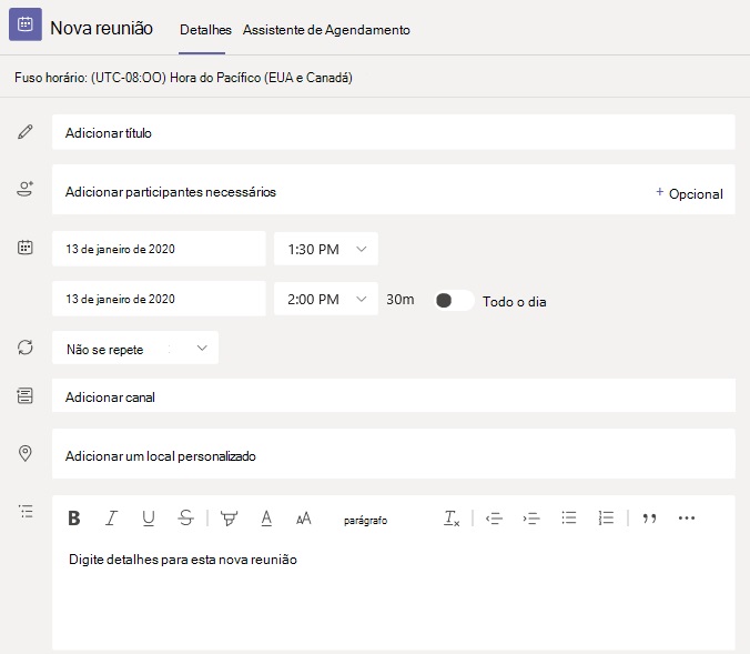 ATENÇÃO: o calendário no Teams está conectado ao seu calendário do Exchange. Em outras palavras, ao agendar uma reunião no Outlook, ela aparecerá no Teams e vice-versa.