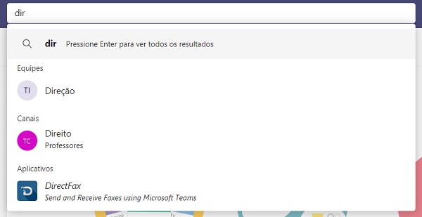 Barra de Pesquisa: fica na parte superior central do aplicativo. Pode ser usado para pesquisar equipes, aplicativos, canais, chats entre outros.