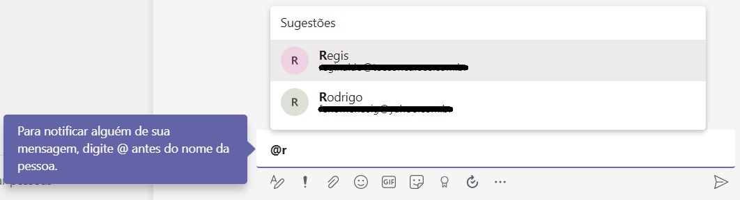 Marcar usuário (mencionar): como é comum em aplicativos de comunicação é possível mencionar um usuário em um chat ou canal. Basta digitar @ antes de seu nome e, em seguida, selecioná-la no menu que aparece.