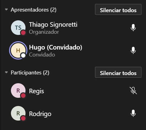 É interessante notar que as funções de apresentador e participante podem ser exercidas por pessoas da mesma organização ou por pessoas externas, chamadas de convidados - neste caso há restrições de uso de ferramentas da reunião mesmo que o convidado seja apresentador. No exemplo abaixo, o convidado Hugo foi colocado como apresentador.
