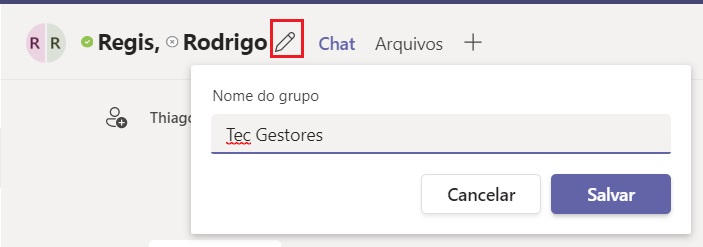 No caso de chats com mais de um participante, o MS Teams nos dá a possibilidade de dar um nome aquele grupo e assim você poder referenciá-lo em novas conversas (ao invés de ter de colocar cada pessoa novamente).