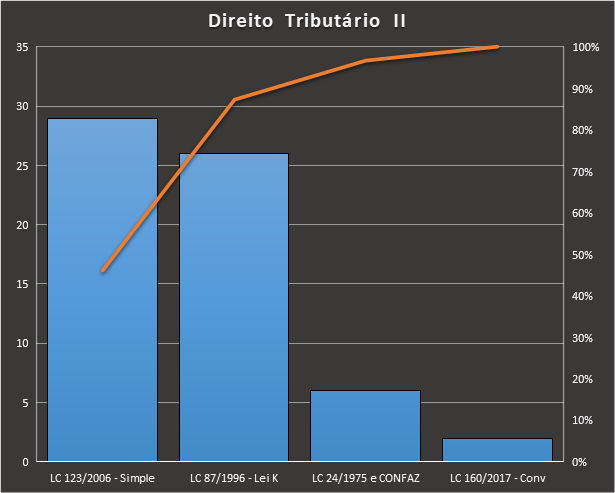 1) Direito Tributário II Em Direito Tributário II, nos baseamos neste caderno: https://www.tecconcursos.com.br/s/Q2A1Hi, contendo 63 questões. Usamos como filtro questões da área fiscal elaboradas pela banca FGV. Praticamente metade das questões cobra Simples Nacional e 41% das questões cobram Lei Kandir. Veja a distribuição.