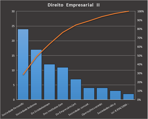 4) Direito Empresarial II Para esta matéria nos baseamos neste caderno: https://www.tecconcursos.com.br/s/Q2AAQH, contendo 84 questões. Usamos como filtro questões da área fiscal elaboradas pela banca FGV, resultando na seguinte distribuição: