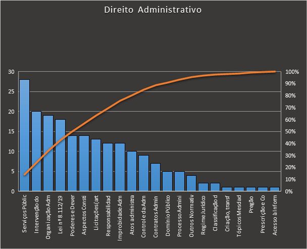 Destacados de azul nessa tabela estão 9 tópicos cuja probabilidade acumulada é de 75%. Isso significa que esses 9 tópicos cobrem 75% de todas as questões da matéria que obedecem aos filtros utilizados. Os destaques vão para Serviços públicos, Intervenção do Estado na propriedade provada, Organização administrativa, Lei 8.112, e Poderes e deveres da administração, que juntos abrangem metade das questões. Veja a distribuição: