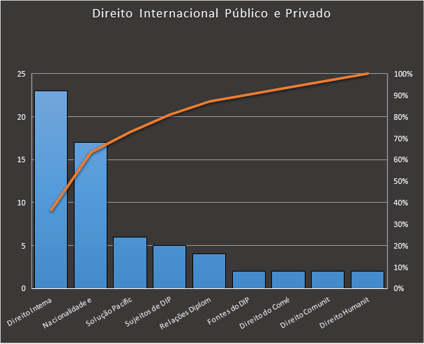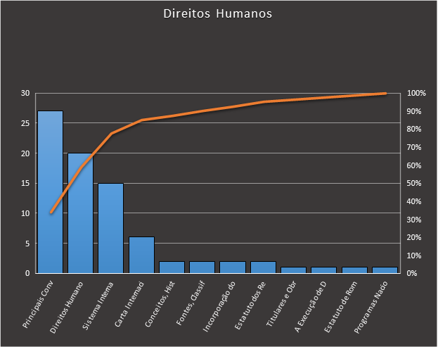Em Direitos Humanos , nos baseamos neste caderno: https://www.tecconcursos.com.br/s/Q1YGdr, contendo 80 questões. Usamos como filtro questões da banca FGV para exames da OAB. Veja como ficou a distribuição.