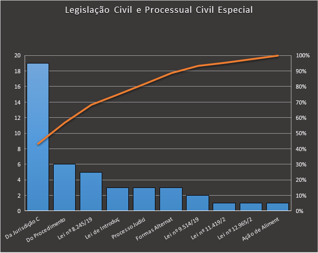 Em Legislação Civil e Processual Civil Especial , nos baseamos neste caderno: https://www.tecconcursos.com.br/s/Q1YGdr, contendo 44 questões. Usamos como filtro questões da banca FGV para exames da OAB. Veja como ficou a distribuição.