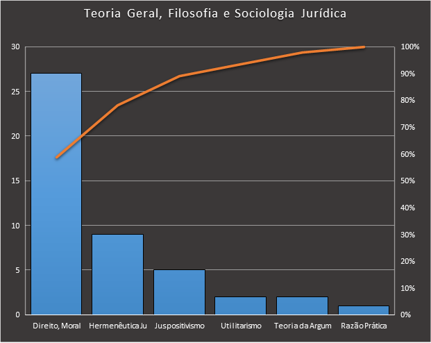 Em Teoria Geral, Filosofia e Sociologia Jurídica , nos baseamos neste caderno: https://www.tecconcursos.com.br/s/Q1YGdr, contendo 46 questões. Usamos como filtro questões da banca FGV para exames da OAB. Veja como ficou a distribuição.