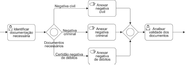 No diagrama, o primeiro gateway “Documentos necessários” testará o resultado da atividade anterior. Se na execução da atividade “Identificar documentação necessária” o usuário tiver necessidade de um, dois ou três dos documentos requeridos, um ou mais fluxos será/serão executados
