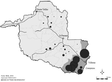 Os círculos contidos no mapa mostrado anteriormente, que ilustra o estado de Rondônia, representam