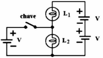 No circuito representado na figura a seguir, têm-se duas lâmpadas incandescentes idênticas, L 1 e L2, e três fontes idênticas, de mesma tensão V.