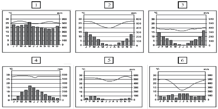 Devido a sua extensão e posição geográfica, o território brasileiro é atingido por uma variedade de climas. Observe os gráficos que se associam a cada tipo climático brasileiro.