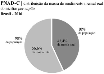 O gráfico a seguir mostra que, em 2016, mais de 40% da massa de renda mensal real domiciliar per capita coube a 10% da população; ao restante coube menos de 60% dessa massa de renda. A partir do gráfico, é correto inferir que, naquele ano, em média, a renda mensal desses 10% da população era superior a R$ 10.000.