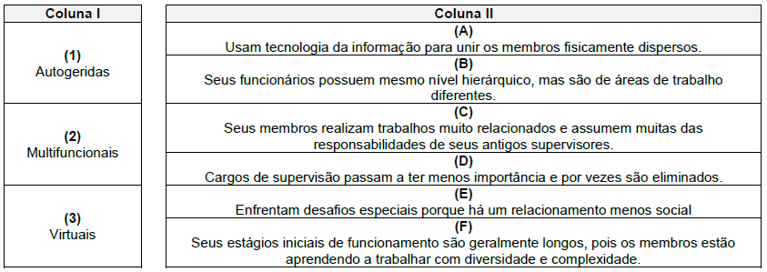 Analise o quadro abaixo, onde as colunas I e II listam aspectos dos tipos de equipes de trabalho comumente encontradas nas organizações e suas definições (misturados em ordem aleatória):