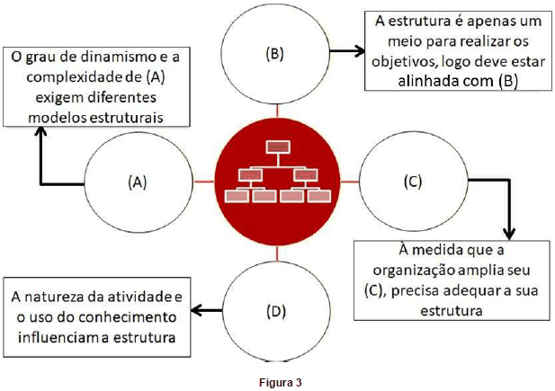 Para responder a questão, observe atentamente a figura 3, abaixo. Os componentes nomeados por (A), (B), (C) e (D) representam variáveis que condicionam a estrutura organizacional.