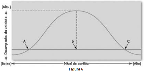 No livro “Fundamentos do Comportamento Organizacional”, os autores discutem a relação entre o nível de conflito e o desempenho da unidade, apresentando-a em um gráfico, que está adaptado na figura 6 abaixo.