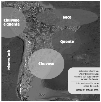 O mapa a seguir expõe os efeitos sobre o Brasil e outras porções da América do Sul de um fenômeno geográfico de suma importância aos estudos do meio ambiente. Observe-o.