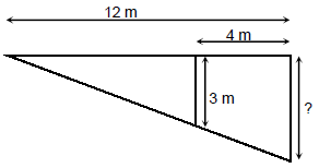 A distância entre as colunas de sustentação é de 4 m, a plataforma mede 12 m, e a coluna menor mede 3 m. Qual a medida da outra coluna de sustentação?
