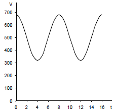 O volume V, em litros, de água presente em um reservatório, varia em função do tempo segundo a função V(t) = 500 + 180∙sen \; { \large \left ( \pi t \over 4\right) } , com t medido em horas. Assinale a afirmação incorreta, de acordo com esses dados.