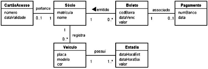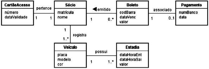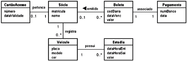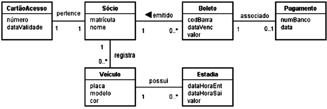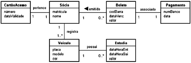A empresa que irá administrar o estacionamento de um clube decidiu desenvolver um sistema de informação específico para isso. Apenas os sócios poderão ter acesso ao estacionamento. Assim sendo, o sócio que tiver interesse em usar o estacionamento terá de procurar o balcão da empresa para se registrar no sistema. No ato do registro, serão informados o nome do sócio e a sua matrícula no clube, além de ser gerado, automaticamente, o número do cartão de acesso ao estacionamento e a data de validade desse cartão. Cada cartão só poderá ser usado por um único sócio. Após ser cadastrado no sistema, um sócio poderá registrar os dados (placa, modelo e cor) dos veículos que ele irá estacionar. Um veículo só pode ser registrado por um único sócio. O cadastramento dos veículos é obrigatório, pois uma câmera de vídeo irá capturar os caracteres das placas para verificar se eles estão devidamente cadastrados. Caso não o estejam, a cancela que dá acesso ao estacionamento não será aberta. Após a saída de um veículo, o sistema irá registrar o período em que ele ficou no estacionamento. Esse registro irá conter a data e a hora de entrada, a data e a hora de saída, e o valor a ser pago pela estadia. No final do mês, será gerado um boleto para cada sócio que utilizou o estacionamento durante o mês em questão. O boleto terá um número de código de barra, a data de vencimento e o valor a ser pago. Quando o boleto for pago, será inserido no sistema um registro de pagamento, que irá informar o número do banco em que o boleto foi pago e a data do pagamento.