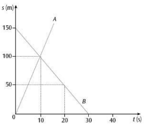 As retas indicadas a seguir representam as posições s (em metros), em função do tempo t (em segundos) de dois móveis A e B que estão na mesma trajetória.