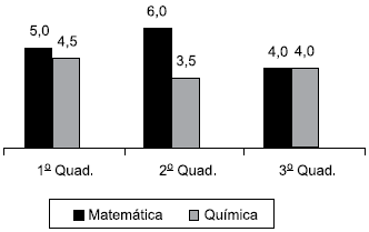 O gráfico apresenta as notas de um aluno, nas disciplinas de matemática e química, nos três quadrimestres de 2019.