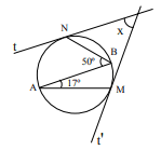Sejam AB o diâmetro da circunferência, e as retas t e t’ tangentes a ela nos pontos N e M, respectivamente. O valor de x é