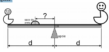Dois garotos de massas iguais a 40 kg e 35 kg sentaram em uma gangorra de 2 metros de comprimento para brincar. Os dois se encontravam à mesma distância do centro de massa e do apoio da gangorra que coincidiam na mesma posição. Para ajudar no equilíbrio foi usado um saco de 10 kg de areia. Considerando o saco de areia como ponto material, qual a distância, em metros, do saco de areia ao ponto de apoio da gangorra?